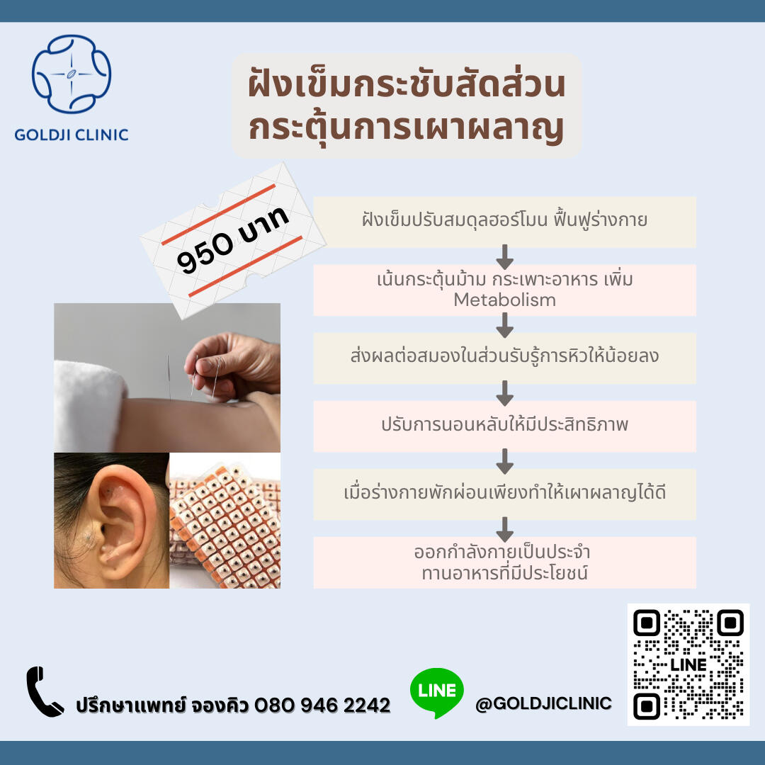 ฝังเข็มปรับสมดุลฮอร์โมนทั้งร่างกายเน้นกระตุ้นม้าม กระเพาะอาหาร เพิ่ม metabolism และยังมีผลกับสมองส่วนรับรู้เรื่องความหิวให้น้อยลง รวมถึงปรับการนอนหลับให้มีประสิทธิภาพ เมื่อร่างกายได้พักผ่อนอย่างเพียงพอจะทำให้เผาผลาญได้ดีเช่นกัน
