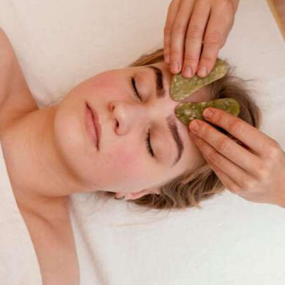 กัวซา กวาซา (Gua Sha) ใช้แผ่นหิน หยก หรือเขาสัตว์ธรรมชาตินำมากดและขูดบนใบหน้า เพิ่มการไหลเวียนเลือด รีดไล่น้ำเหลืองที่คั่งค้างตามแนวกรอบหน้า ทำให้ดูอ่อนวัย ผิวเปล่งปลั่งอมชมพู ลดความหมองคล้ำ ยกกระชับใบหน้า